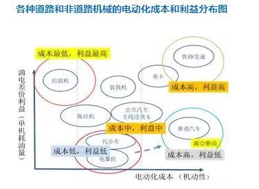 從圖上我們也發(fā)現(xiàn)一個過去沒有重視的地方,就是挖掘機。它其實應(yīng)該是電動經(jīng)濟效益最大,而成本最低的機械!
