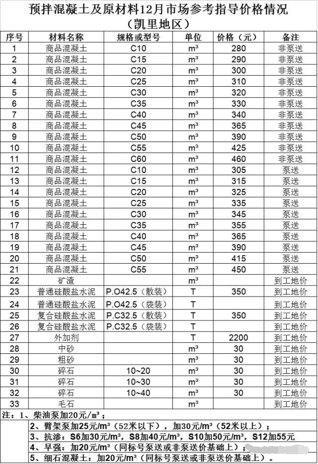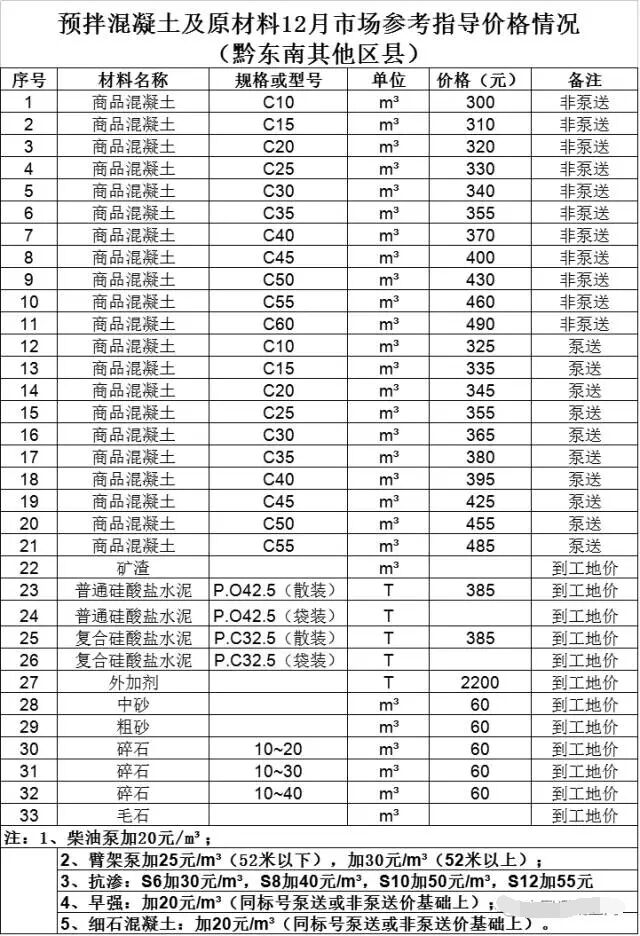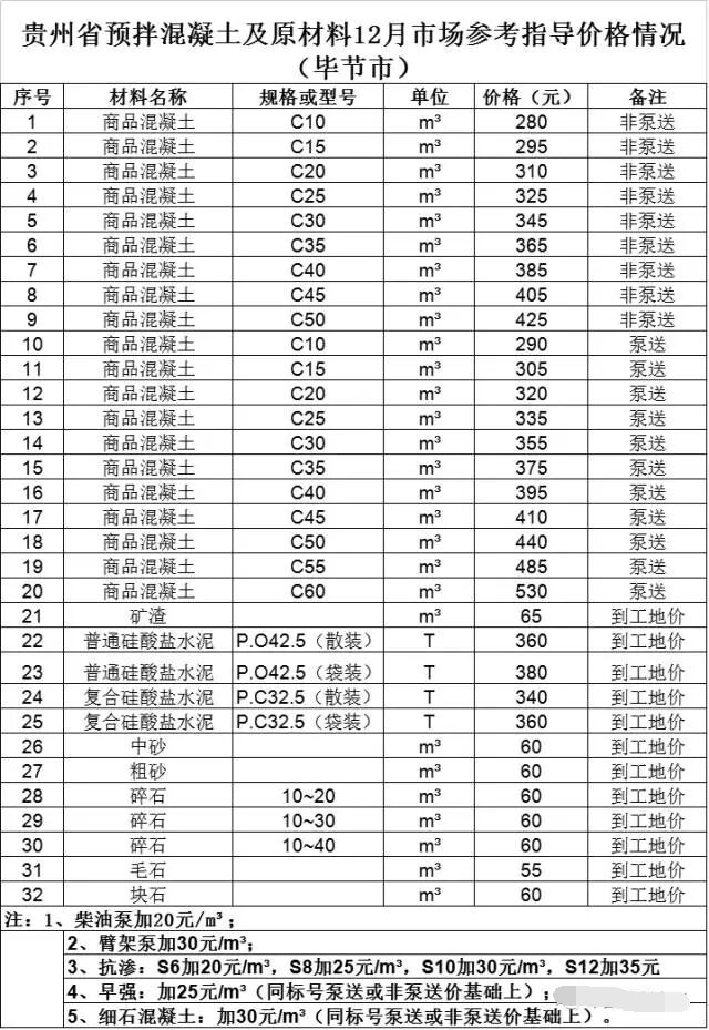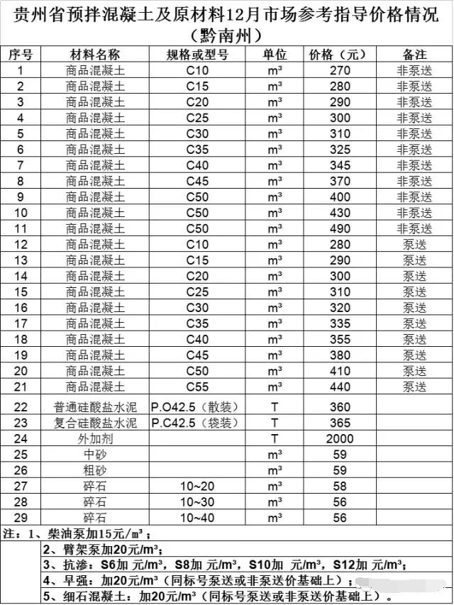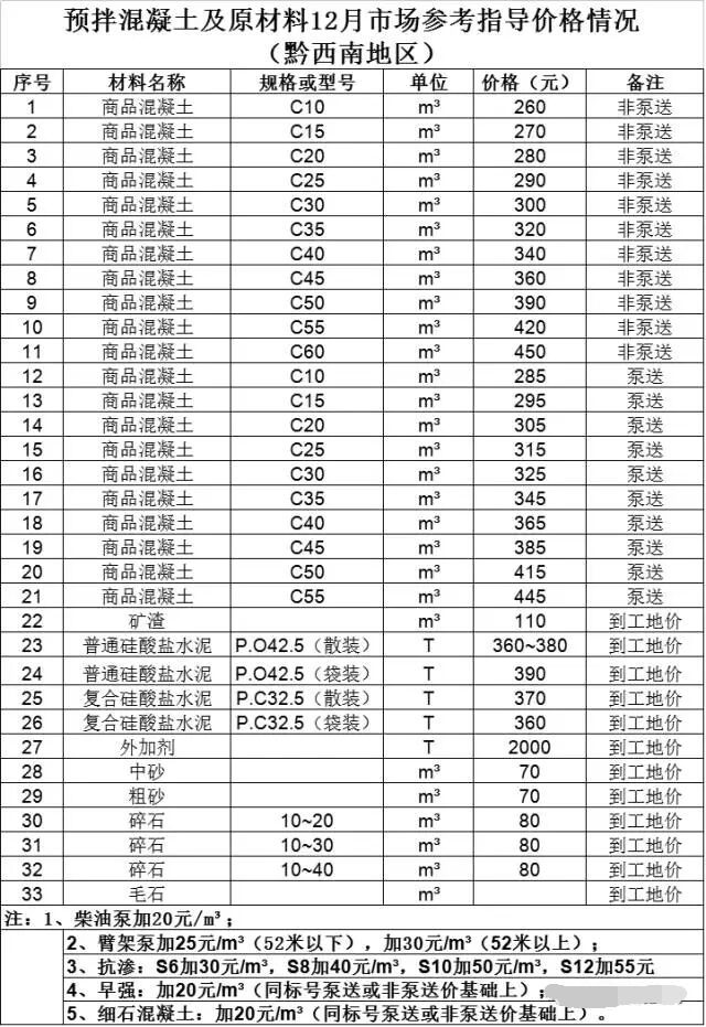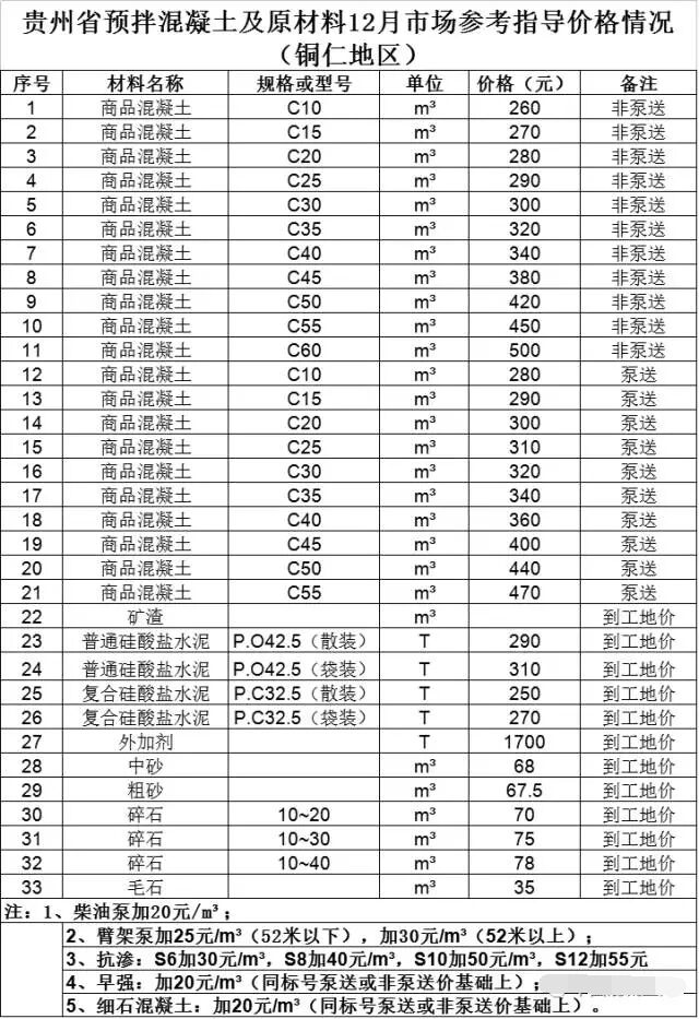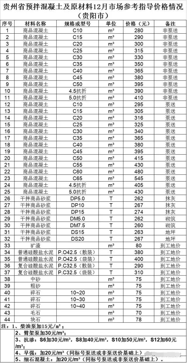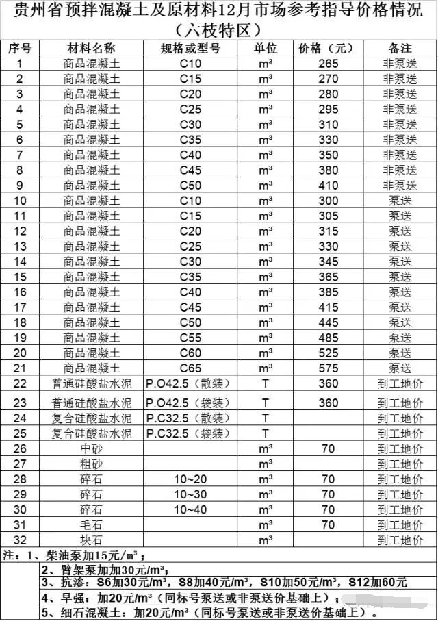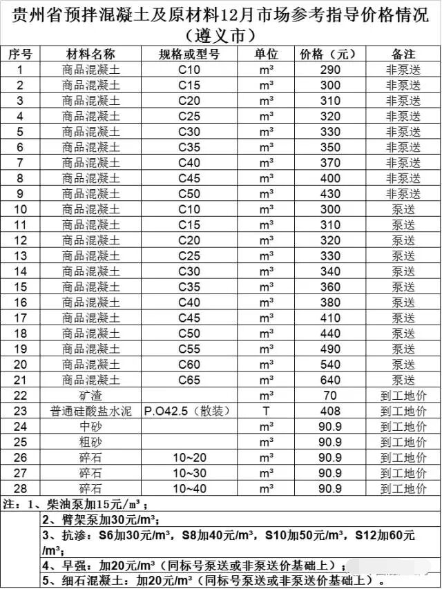 貴州省預(yù)拌混凝土及原材料12月市場(chǎng)參考指導(dǎo)價(jià)格情況
