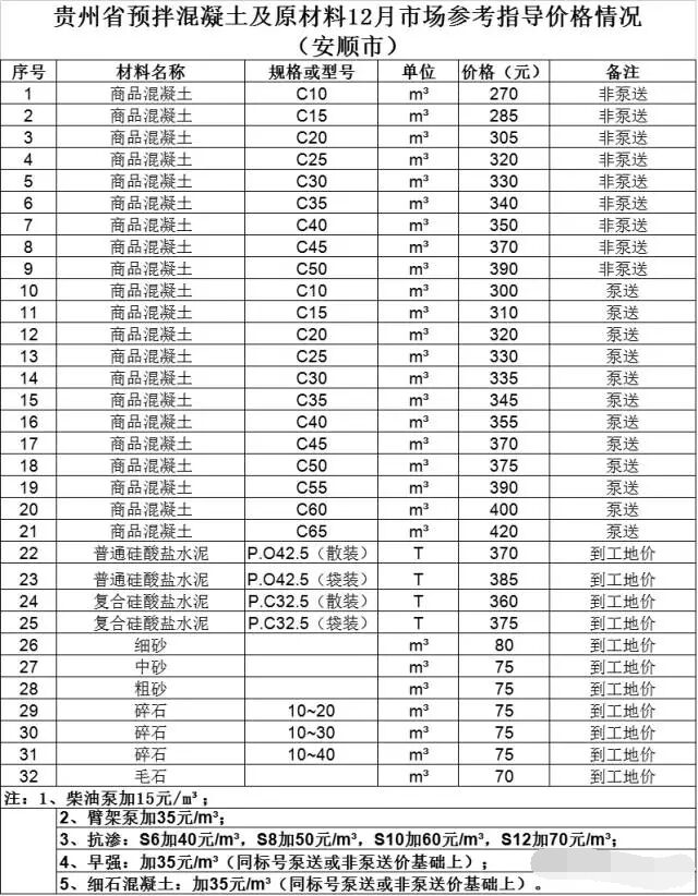 【行情數(shù)據(jù)】貴州省預(yù)拌混凝土及原材料12月市場(chǎng)參考指導(dǎo)價(jià)格情況