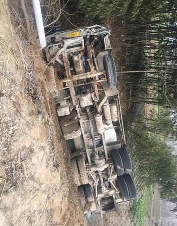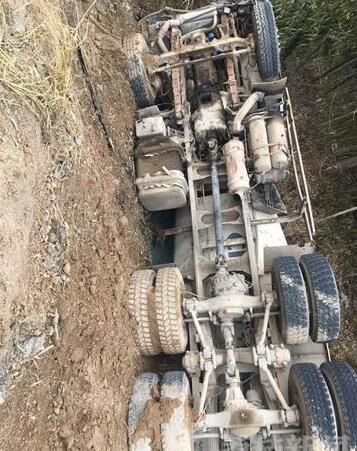 記者趕到現(xiàn)場(chǎng)從很遠(yuǎn)地方就可以看到一輛攪拌車橫躺在渠中,零部件散落一地,攪拌車有不同程度的受損。