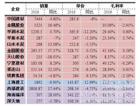 2016年,全國商品混凝土產(chǎn)量17.9億立方米,同比增長7.4%,混凝土與水泥制品行業(yè)實(shí)現(xiàn)利潤總額658億元,同比增長4.1%。從上市企業(yè)來看,14家由混凝土業(yè)務(wù)經(jīng)營的企業(yè)總銷量同比增長6.25%,但由于大部分企業(yè)混凝土銷售價(jià)格出現(xiàn)回落,導(dǎo)致13家企業(yè)(除金隅股份)整體銷售收入同比只有1.25%的提升,而11家企業(yè)(除中國建材、金隅股份、山水水泥)整體毛利潤同比下滑3.3%。