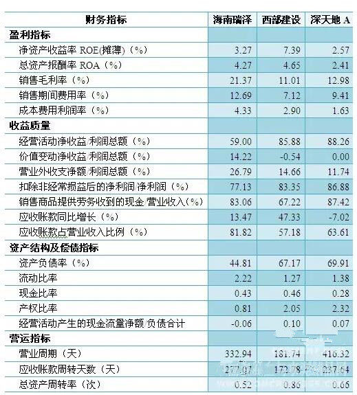 西部建設(shè)、深天地的資產(chǎn)負(fù)債率復(fù)合行業(yè)平均水平,海南瑞澤負(fù)債率較低,償債風(fēng)險(xiǎn)偏低,同時(shí)其他償債指標(biāo)也顯示海南瑞澤具有較低的債務(wù)風(fēng)險(xiǎn),但由于經(jīng)營活動(dòng)產(chǎn)生的現(xiàn)金凈流量為負(fù)值,因此主營業(yè)務(wù)正常經(jīng)營的償債能力較弱,有待提升業(yè)務(wù)正常經(jīng)營的穩(wěn)定性和盈利能力。