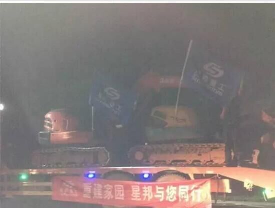 當(dāng)晚在重災(zāi)區(qū)壩塘鎮(zhèn),星邦重工組織的6臺挖機連夜運到,同時到達的還有災(zāi)區(qū)急需的物資。