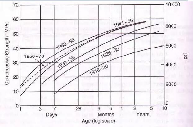 混凝土的大頭就是水泥。水泥是影響混凝土質量的最重要因素之一。28d齡期以后強度不增長,早期水化熱高,早期開裂顯著等問題,這都是當前混凝土生產(chǎn)用水泥存在一些常人難以理解的。盡管混凝土質量控制影響因素較多,但20世紀20年代以來,從水泥工業(yè)的發(fā)展背景來看,盡管水泥外貌并沒有顯著變化,但是水泥的礦物組份和強度等性能隨著水泥工業(yè)的現(xiàn)代化進程而發(fā)生了巨大變化,這些變化均對于今天的混凝土質量控制產(chǎn)生了重要影響。A. M. Neville 在《Properties ofconcrete》(Fourth Edition)一書中指出水泥變化可概括如下四點:
