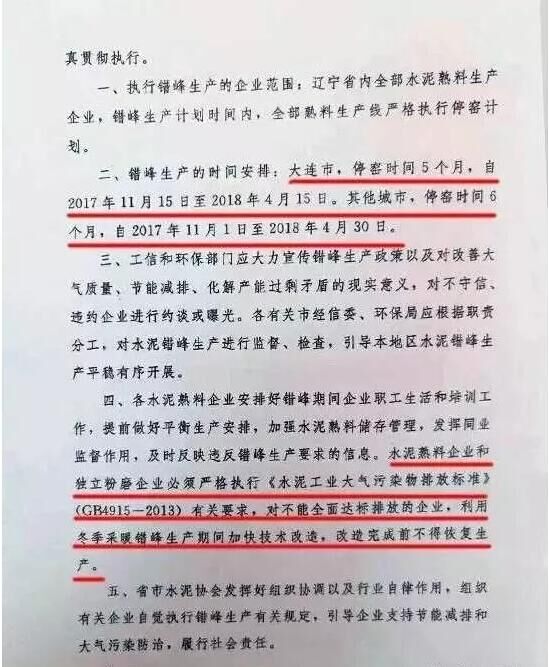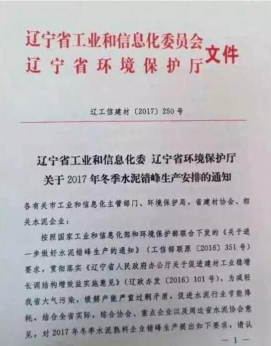 日前,遼寧省工信委和遼寧省環(huán)保廳聯(lián)合發(fā)文要求遼寧省水泥企業(yè)于今年11月開始啟動水泥行業(yè)采暖季錯(cuò)峰停產(chǎn)計(jì)劃,除大連市以外的其他城市的全部水泥熟料生產(chǎn)企業(yè)錯(cuò)峰停產(chǎn)6個(gè)月,錯(cuò)峰生產(chǎn)自今年11月1日起停至明年春天4月末結(jié)束。
