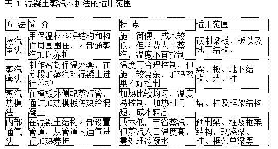 蒸汽法養(yǎng)護按照不同的加熱方式可以分為蒸汽室法、蒸汽套法、毛管模板法、蒸汽熱模法和內部通氣法,其特點及使用的范圍見表 1。