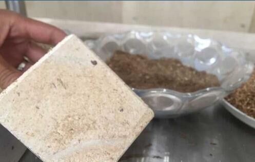 上生產(chǎn)出來的鋼鈣秸稈實(shí)心墻板已擺放得整整齊齊。“這些機(jī)器‘吃’進(jìn)去的是秸稈,‘吐’出來的是墻板,正適合當(dāng)作建筑外墻屋面材料?!痹摴窘?jīng)理文華銀拿出了一塊墻板樣品,側(cè)切面能清晰地看到秸稈碎屑。盡管摸上去第一感覺像木頭,但用手使勁兒敲打卻能感受到足夠的硬度,“每平米墻板所含的秸稈能達(dá)到60%至80%?!?