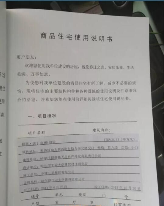 在哈爾濱市城鄉(xiāng)建設(shè)委員會(huì)官方網(wǎng)站上,記者查到了“招商諾丁山 05 地塊 8#樓”的《哈爾濱市工程竣工驗(yàn)收備案證》,備案號(hào)為黑建備字號(hào)2015380,建設(shè)單位為哈爾濱招商嘉天房地產(chǎn)開(kāi)發(fā)有限責(zé)任公司,施工單位為中建三局集團(tuán)有限公司,監(jiān)理單位為哈爾濱工業(yè)大學(xué)建設(shè)項(xiàng)目管理公司,開(kāi)竣工日期為2014年6月15日-2015年12月18日,備案日期2015年12月18日。