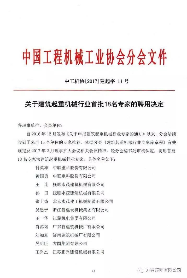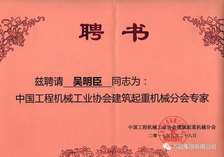 在11月9日召開的中國工程機械工業(yè)協(xié)會建筑起重機械分會年會上,以中工機協(xié)【2017】建起字11號文件公布了《關于建筑起重機械行業(yè)首批18名專家的聘用決定》,聘用首批18名專家為建筑起重機械行業(yè)專家,方圓集團副總工程師吳明臣名列其中。