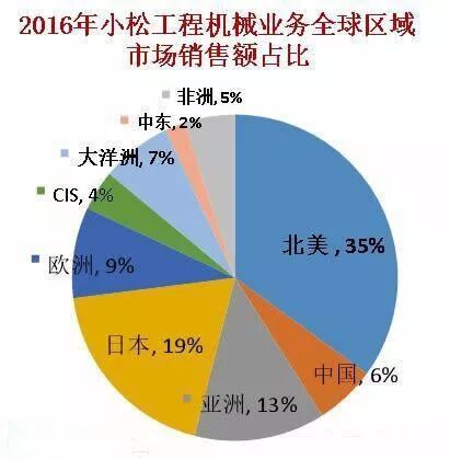 盡管每年有大筆收入來(lái)自中國(guó),但小松工程機(jī)械業(yè)務(wù)最大的市場(chǎng)其實(shí)是北美,銷售額占比35%;中國(guó)銷售占比只有6%,還不如日本本土——19%。