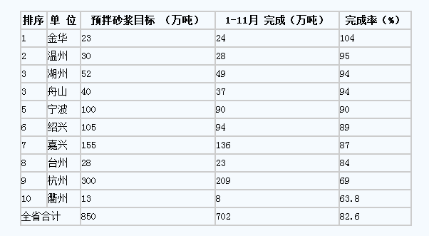 1-11月,杭州等10市預(yù)拌砂漿全年目標(biāo)任務(wù)完成情況如下: