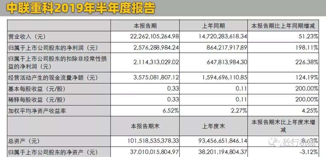 2019年上半年?duì)I業(yè)收入:222.62億元歸屬于上市公司股東凈利潤(rùn):25.76億元8月30日晚,中聯(lián)重科官方發(fā)布了2019年半年度報(bào)告。報(bào)告顯示,中聯(lián)重科上半年實(shí)現(xiàn)營(yíng)業(yè)總收入222.6億元,同比增長(zhǎng)51.23%;包括海外市場(chǎng)實(shí)現(xiàn)營(yíng)業(yè)收入16.84億元,同比增長(zhǎng)2.61%。歸屬于上市公司股東的凈利潤(rùn)25.76億元,同比增長(zhǎng)198.11%。相比較上面的徐工機(jī)械,雖然總營(yíng)業(yè)額相差了88個(gè)多億,但是,凈利潤(rùn)比徐工多了2.93億元。所以,從盈利能力來(lái)說(shuō),中聯(lián)表現(xiàn)比徐工要好。中聯(lián)重科的優(yōu)勢(shì)產(chǎn)業(yè)主要集中在混凝土機(jī)械、塔式起重機(jī)械、環(huán)衛(wèi)機(jī)械、農(nóng)業(yè)機(jī)械這四個(gè)領(lǐng)域?yàn)橹?,其中,建筑起重機(jī)械、長(zhǎng)臂架泵車保持行業(yè)第一,汽車起重機(jī)國(guó)內(nèi)市場(chǎng)份額較年初增長(zhǎng)6.8%。從目前中聯(lián)的發(fā)展趨勢(shì)來(lái)看,也在積極的擴(kuò)展高空作業(yè)平臺(tái)、土方機(jī)械、機(jī)制砂、干混砂漿、噴射機(jī)械手等新興業(yè)務(wù)。與此同時(shí),中聯(lián)重科目前也在積極轉(zhuǎn)型,打造人工智能和智能制造,中聯(lián)重科塔機(jī)智能工廠穩(wěn)步達(dá)產(chǎn),高空作業(yè)平臺(tái)臂式智能產(chǎn)線實(shí)現(xiàn)量產(chǎn),攪拌車智能制造產(chǎn)業(yè)園、液壓關(guān)鍵元件產(chǎn)業(yè)園處于規(guī)劃建設(shè)中。作為老牌的國(guó)產(chǎn)工程機(jī)械品牌,中聯(lián)重科一直以來(lái)?yè)碛泻芎玫钠放瓶诒貏e是在混凝土機(jī)械領(lǐng)域,擁有眾多的明星產(chǎn)品,碳纖維長(zhǎng)臂架泵車,國(guó)內(nèi)首創(chuàng),大受市場(chǎng)歡迎。