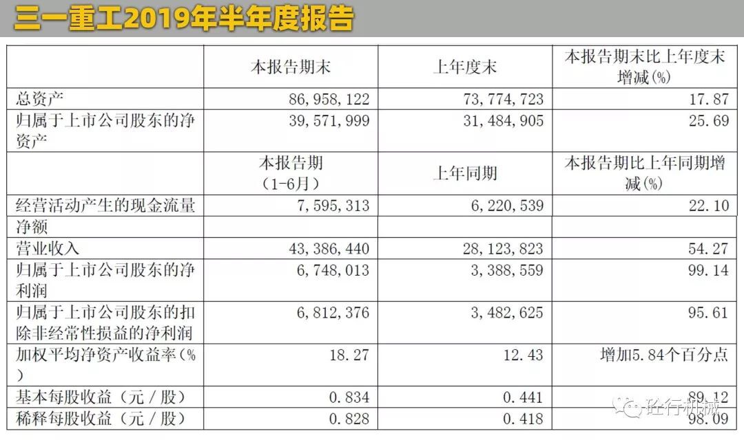 8月29日晚,三一重工官方發(fā)布了其2019年上半年業(yè)績(jī)公告。上半年,公司實(shí)現(xiàn)營(yíng)業(yè)總收入433.86億元,同比增長(zhǎng)54.27%;包括三一國(guó)際銷售收入70.26億元,同比增長(zhǎng)15.34%。歸屬于上市公司股東的凈利潤(rùn)67.48億元,同比增長(zhǎng)99.14%。對(duì)比之下,不管是營(yíng)收能力,還是賺錢能力,三一重工都是最強(qiáng)的,凈利潤(rùn)更是比徐工和中聯(lián)凈利潤(rùn)的總和還要多將近一倍,民營(yíng)重工第一品牌當(dāng)之無(wú)愧。