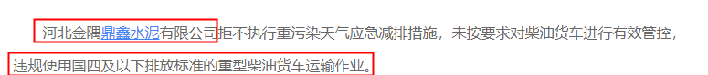 此外,今年10月河北金隅鼎鑫水泥有限公司拒不執(zhí)行重污染天氣應急減排措施,未按要求對柴油貨車進行有效管控,違規(guī)使用國四及以下排放標準的重型柴油貨車運輸作業(yè),被當地環(huán)保部門通報。