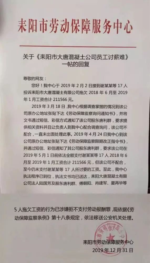 關(guān)于“耒陽市大唐混凝土公司員工討薪難”一貼的回復