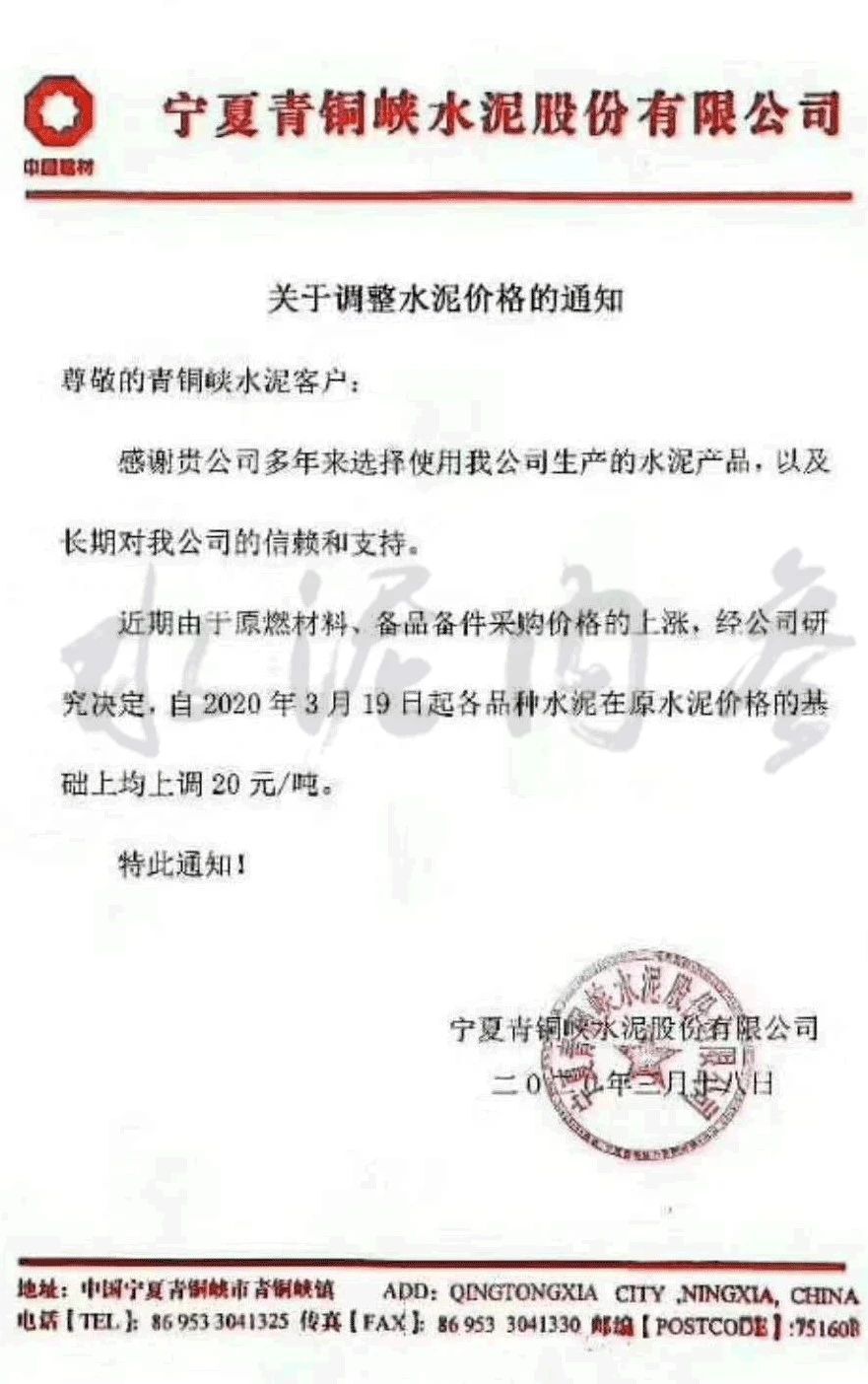 據(jù)消息:寧夏青銅峽水泥有限公司發(fā)布通知,稱由于近期原燃材料、備品備件采購價(jià)格上漲,公司決定自3月19日起各品牌、各品種水泥在原有價(jià)格基礎(chǔ)上上調(diào)20元/噸。