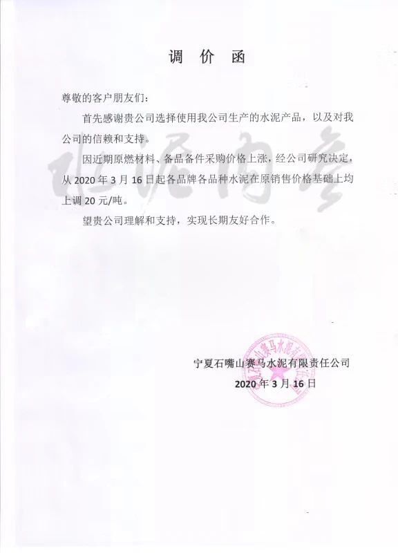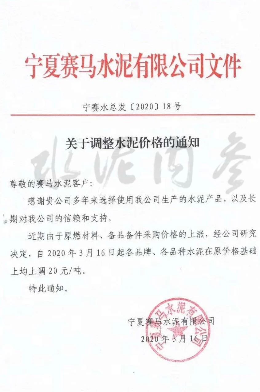 此前,寧夏賽馬水泥有限公司發(fā)布通知,稱由于近期原燃料、備品備件采購價(jià)格上漲,公司決定自3月16日起各品牌、各品種水泥在原有價(jià)格基礎(chǔ)上上調(diào)20元/噸。