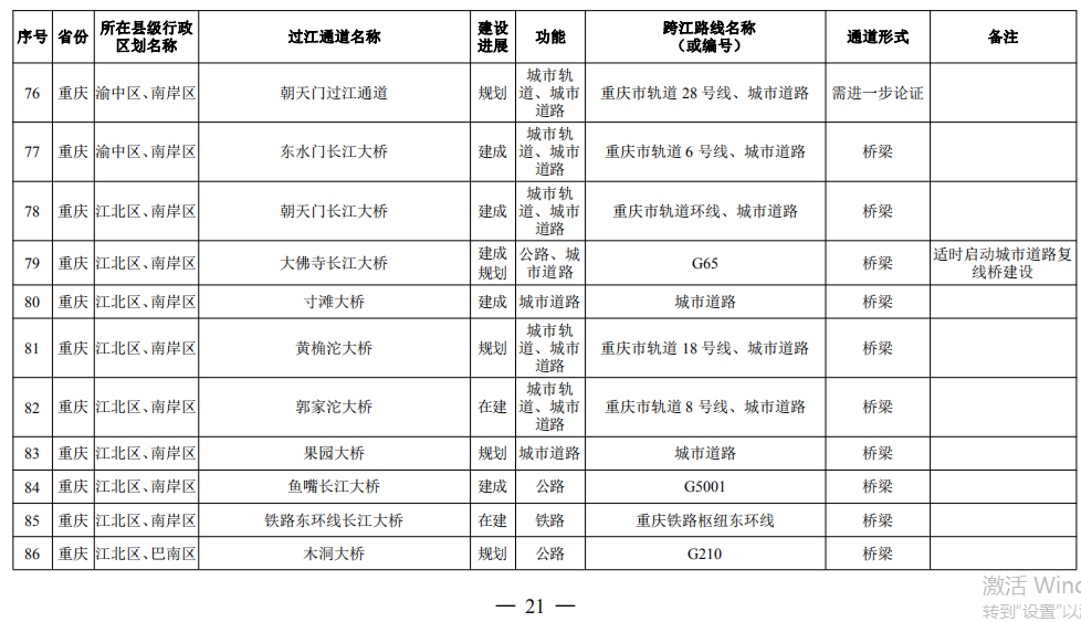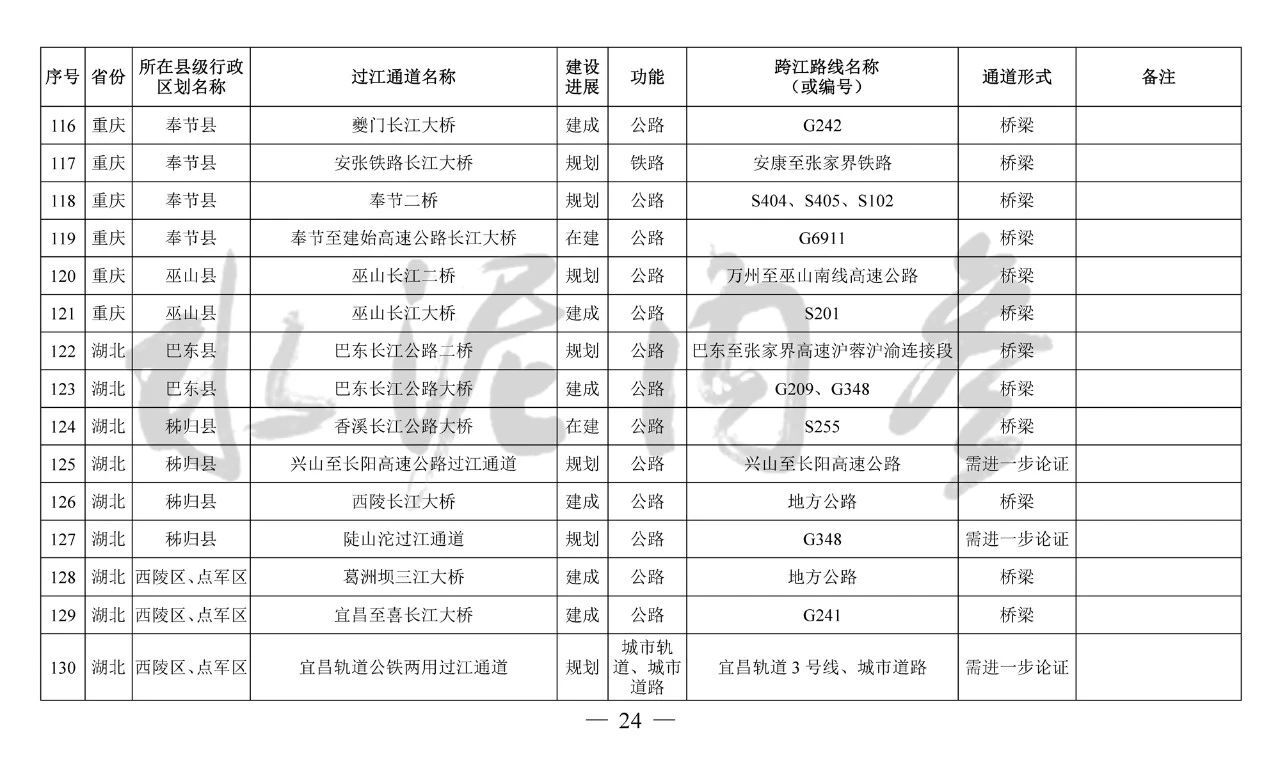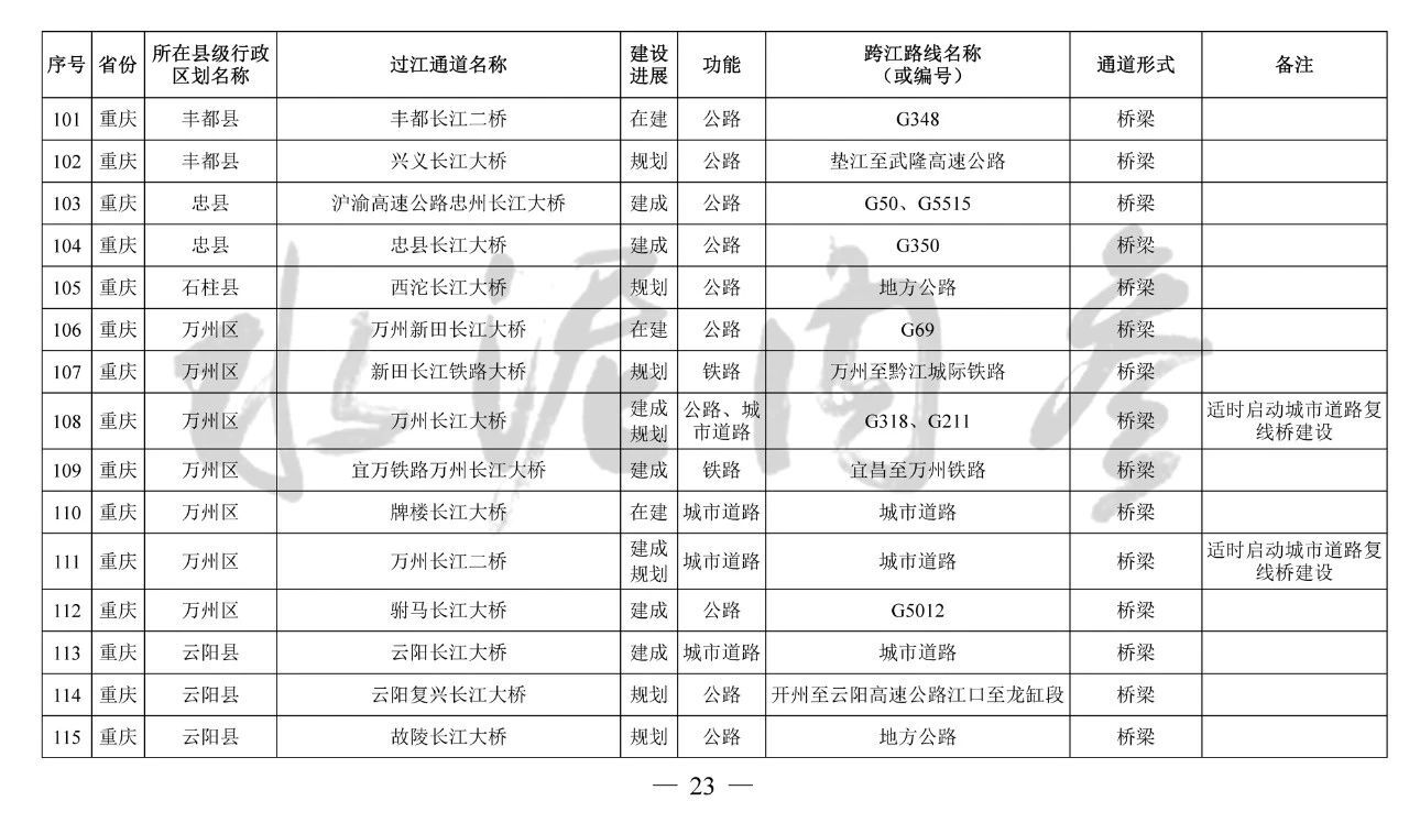 重慶市(17座):市域(郊)鐵路跳蹬至江津線長(zhǎng)江大橋、西彭長(zhǎng)江大橋(支坪長(zhǎng)江大橋)、小南海長(zhǎng)江大橋、中壩過江通道、黃桷坪長(zhǎng)江大橋、軌道27號(hào)線過江通道、重慶至黔江鐵路過江通道、黃桷沱大橋、長(zhǎng)壽長(zhǎng)江三橋、涪陵石沱長(zhǎng)江大橋、涪陵龍頭港長(zhǎng)江大橋、涪陵江北長(zhǎng)江大橋、興義長(zhǎng)江大橋、西沱長(zhǎng)江大橋、云陽(yáng)復(fù)興長(zhǎng)江大橋、奉節(jié)二橋、巫山長(zhǎng)江二橋