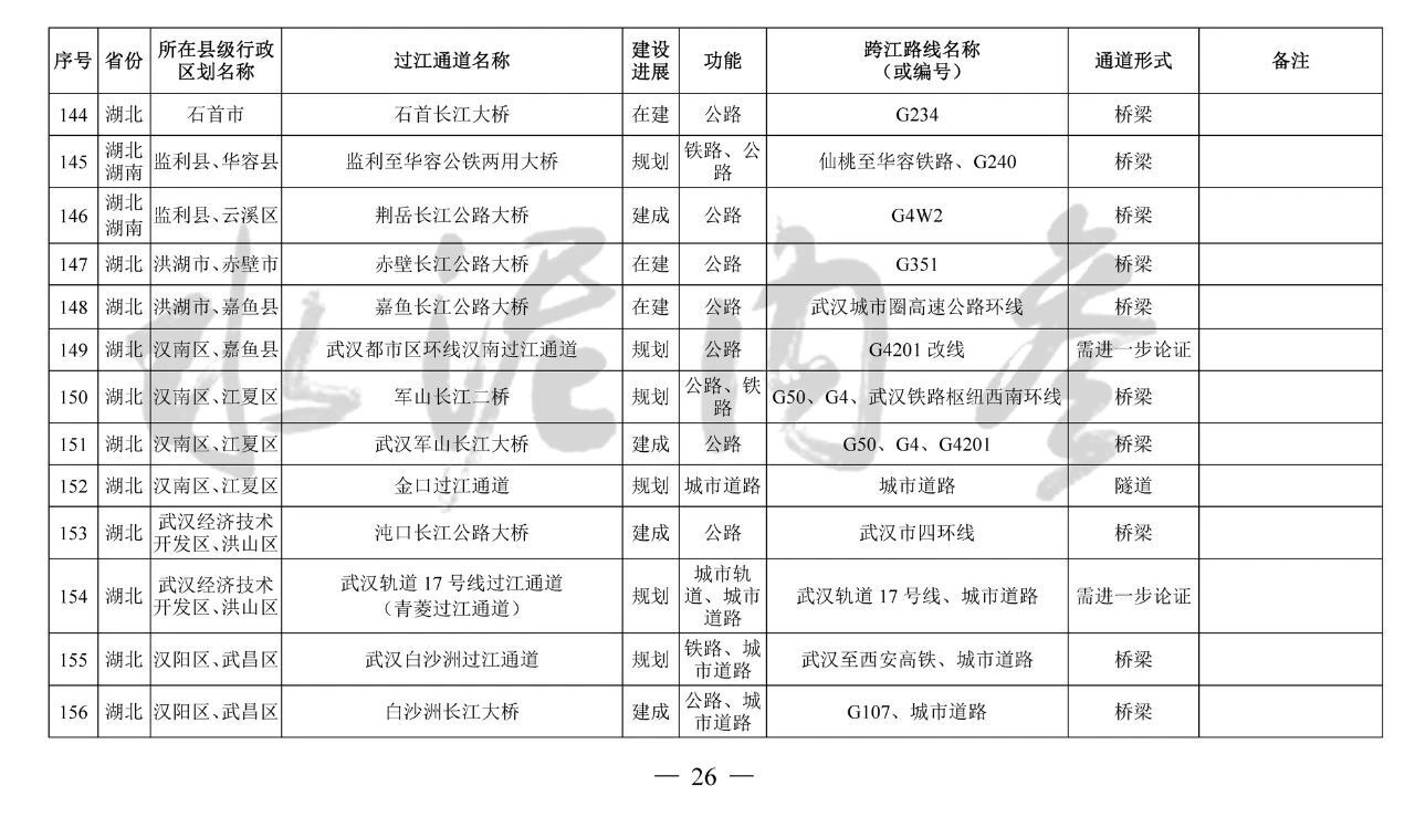 湖北省(24座):巴東長(zhǎng)江公路二橋、興山至長(zhǎng)陽(yáng)高速公路過江通道、宜昌東艷路過江通道、宜都紅花套過江通道、枝江百里洲長(zhǎng)江大橋、李埠長(zhǎng)江公鐵大橋、觀音寺長(zhǎng)江大橋、武漢都市區(qū)環(huán)線漢南過江通道、軍山長(zhǎng)江二橋、武漢軌道17號(hào)線過江通道(青菱過江通道)、武漢白沙洲過江通道、武漢軌道12號(hào)線白沙洲過江通道、武漢軌道11號(hào)線三期漢陽(yáng)段過江通道、武漢軌道13號(hào)線過江通道(小東門過江通道)、二七路過江通道、武漢軌道10號(hào)線二七過江通道、武漢軌道12號(hào)線丹水池過江通道、堤角過江通道、武漢軌道20號(hào)線過江通道、武漢軌道25號(hào)線過江通道(長(zhǎng)江新城過江通道)、武漢軌道新港線陽(yáng)邏過江通道、光谷過江通道、新港高速雙柳長(zhǎng)江大橋、鄂黃第二過江通道鄂湘界(1座):監(jiān)利至華容公鐵兩用大橋