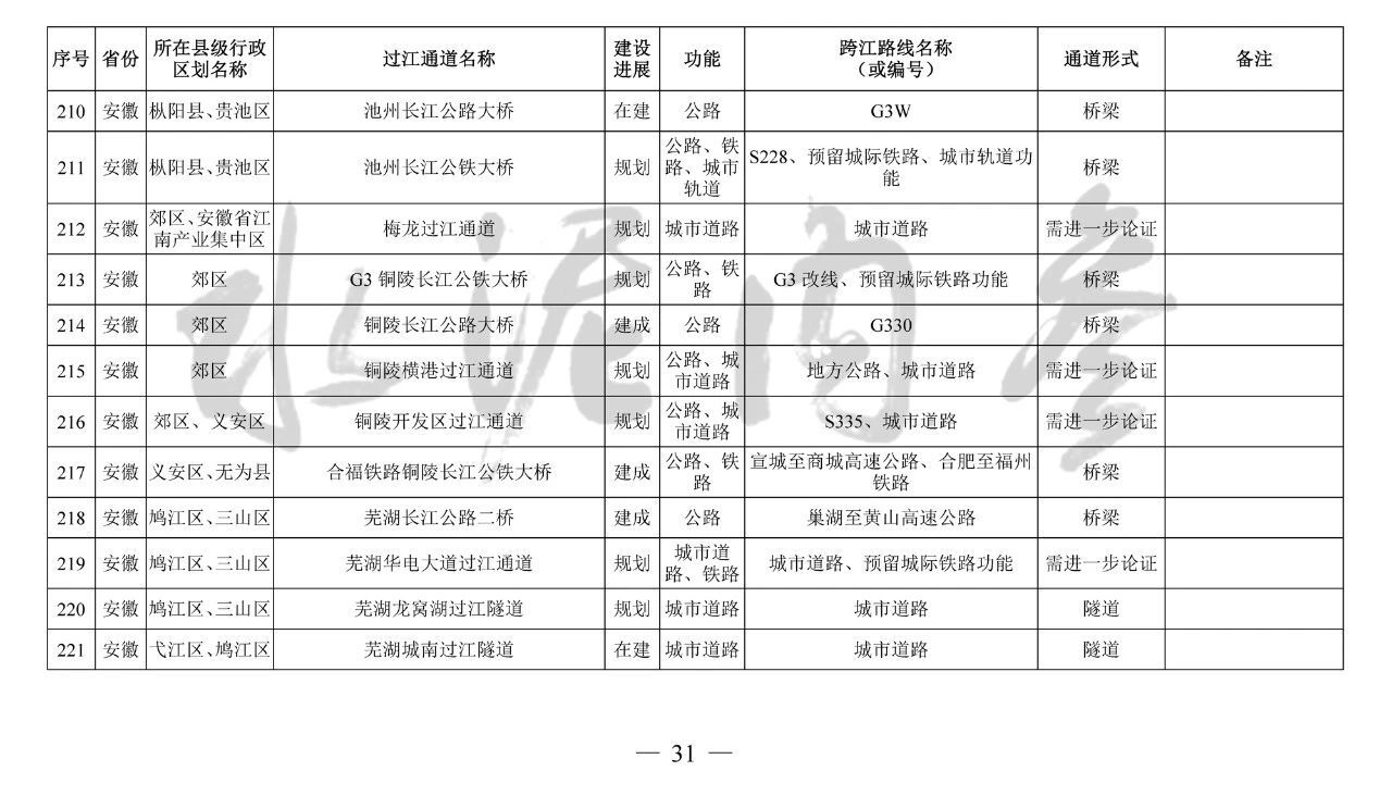 安徽省(9座):望江長(zhǎng)江公鐵大橋、安慶??陂L(zhǎng)江公路大橋、池州長(zhǎng)江公鐵大橋、G3銅陵長(zhǎng)江公鐵大橋、銅陵開發(fā)區(qū)過江通道、蕪湖北京路過江隧道、蕪湖泰山路長(zhǎng)江公鐵大橋、馬鞍山長(zhǎng)江公鐵大橋、馬鞍山九華路過江通道