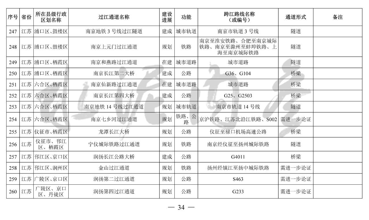 江蘇?。?3座):錦文路過江通道、南京地鐵4號(hào)線過江通道、南京市域快速軌道過江通道、南京上元門過江通道、南京七鄉(xiāng)河過江通道、龍?zhí)堕L(zhǎng)江大橋、寧儀城際鐵路過江通道、潤(rùn)揚(yáng)第二過江通道、江陰第二過江通道、江陰第三過江通道、張皋過江通道、蘇通第二過江通道、海太過江通道