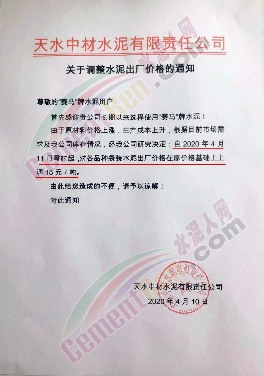 昨日(4月10日)天水中材水泥有限責(zé)任公司通知,由于原材料價(jià)格上漲,生產(chǎn)成本上升,根據(jù)目前市場需求公及公司庫存情況 ,經(jīng)公司研究決定自今日(4月11日)零時(shí)起,對各品種袋裝水泥出廠價(jià)格在原價(jià)格基礎(chǔ)上上調(diào)15元/噸。