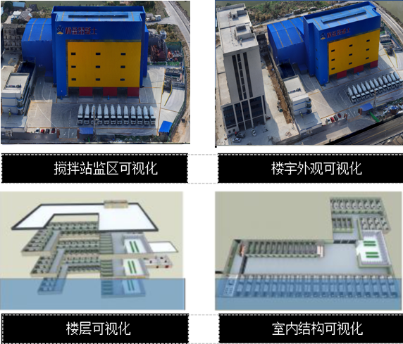 通過3D可視化技術(shù)手段,實現(xiàn)攪拌站全場景3D仿真可視瀏覽。場景構(gòu)建包括攪拌站監(jiān)區(qū)場景、樓宇外觀、樓層、室內(nèi)結(jié)構(gòu)、特定設備內(nèi)部等各層級場景的可視化。