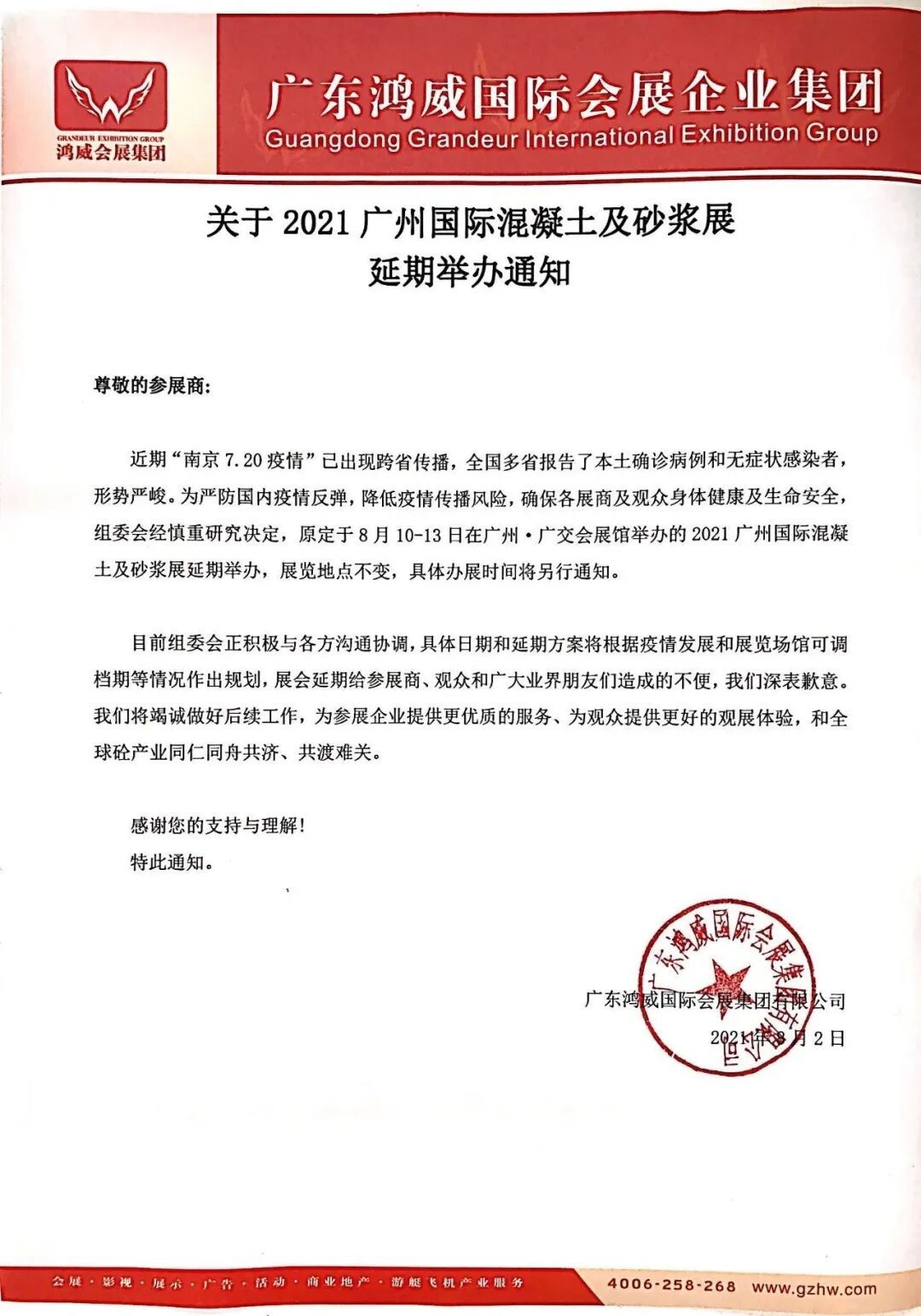 由于當前國內多地出現(xiàn)新型冠狀病毒肺炎新增確診病例、中高風險地區(qū)不斷增加的疫情嚴峻形勢影響,為全力配合做好疫情防控工作,避免大規(guī)模聚集和降低疫情傳播風險,保障參展商、觀眾及工作人員健康安全,維護參展單位權益,確保展會效果,組委會經(jīng)慎重研究決定,原定于8月10-13日在廣州·廣交會展館舉辦的2021廣州國際混凝土及砂漿展延期舉辦,展覽地點不變,具體辦展時間將另行通知。