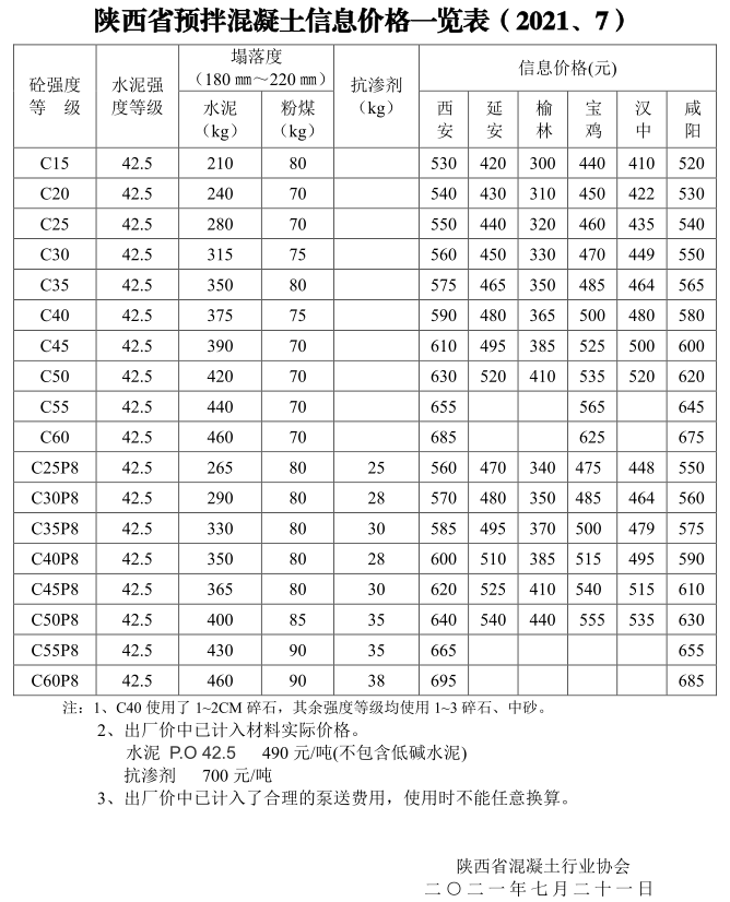 陜西省預(yù)拌混凝土信息價(jià)格一覽表(2021.7)