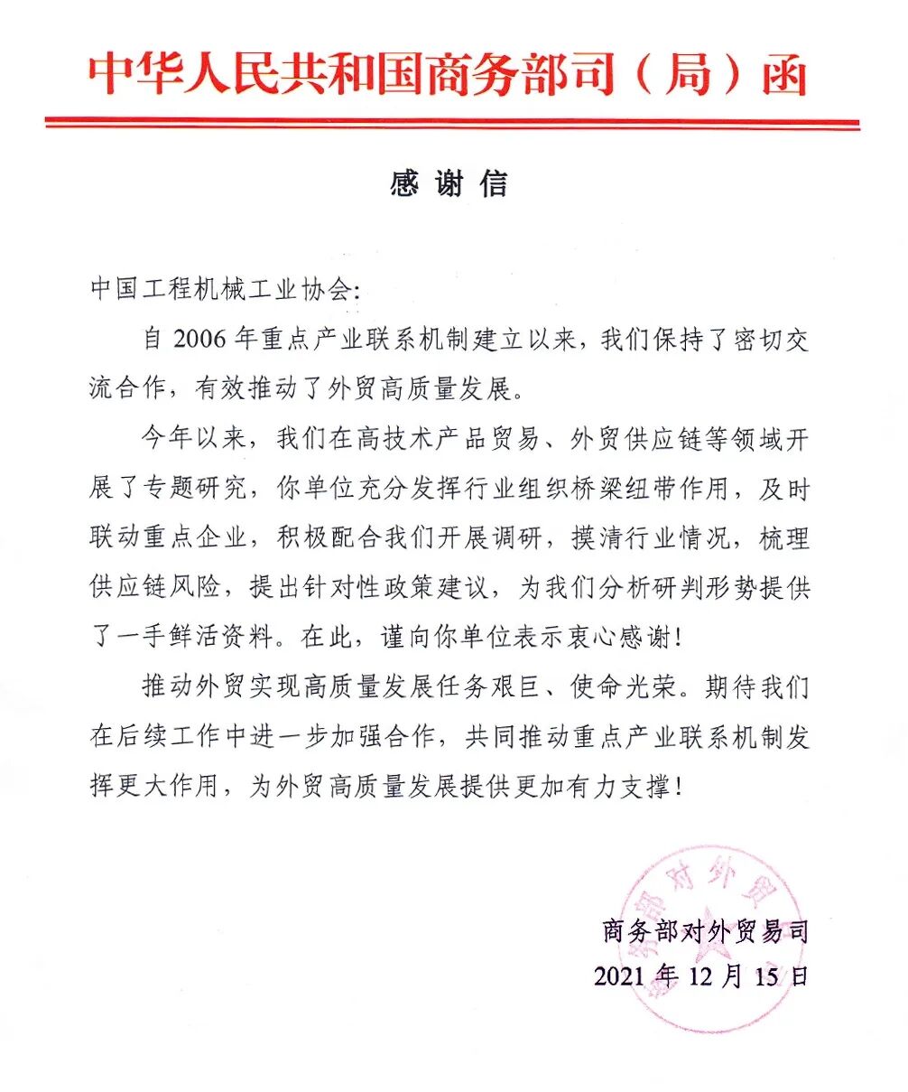 近日,商務(wù)部對(duì)外貿(mào)易司致函中國(guó)工程機(jī)械工業(yè)協(xié)會(huì),就協(xié)會(huì)今年以來,積極配合商務(wù)部對(duì)外貿(mào)易司在高技術(shù)產(chǎn)品貿(mào)易、外貿(mào)供應(yīng)鏈等領(lǐng)域開展了專題研究,收集、整理了大量的行業(yè)外貿(mào)進(jìn)出口情況,受到了高度的肯定。并指出,協(xié)會(huì)充分發(fā)揮行業(yè)組織橋梁紐帶作用,及時(shí)聯(lián)動(dòng)重點(diǎn)企業(yè),積極配合商務(wù)部對(duì)外貿(mào)易司開展調(diào)研,摸清行業(yè)情況,梳理供應(yīng)鏈風(fēng)險(xiǎn),提出針對(duì)性政策建議,為商務(wù)部對(duì)外貿(mào)易司分析研判形勢(shì)提供了一手鮮活資料。在此,謹(jǐn)向協(xié)會(huì)表示衷心感謝!