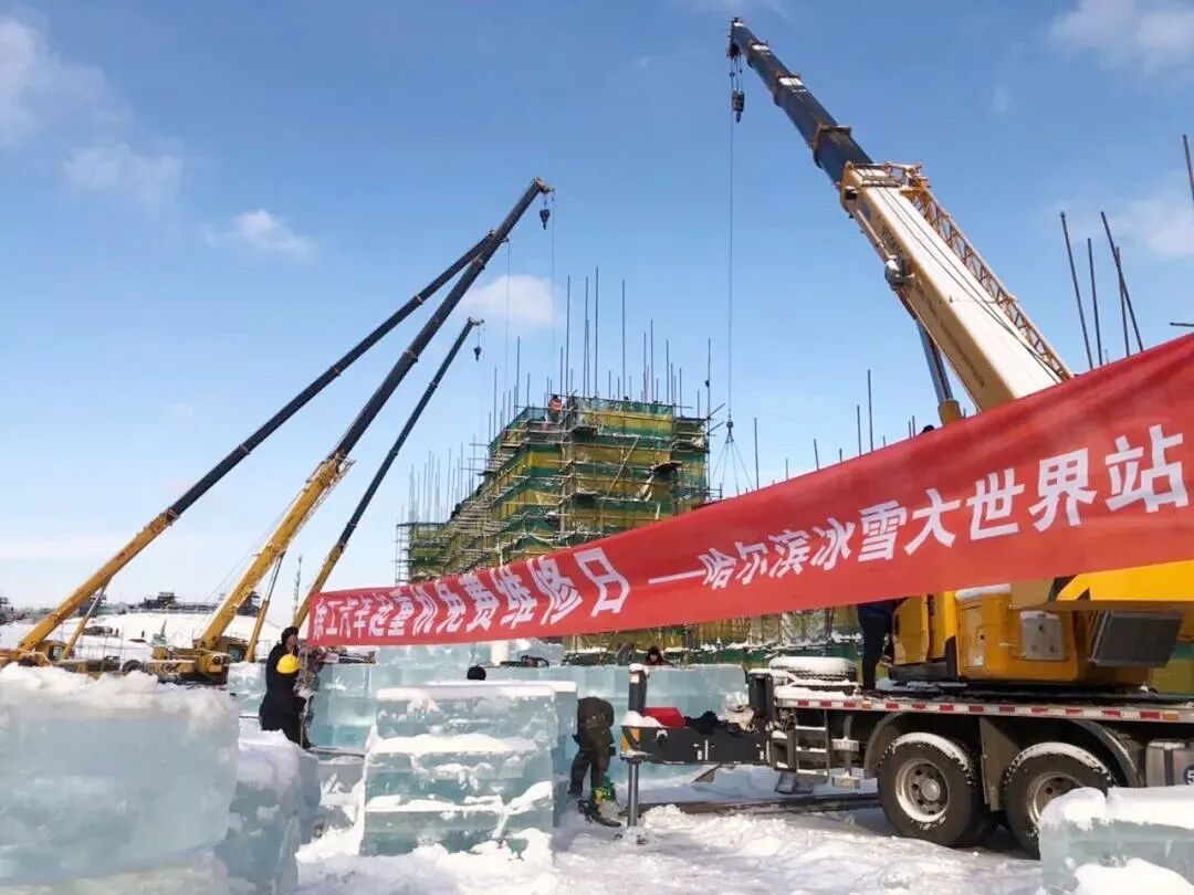 第21屆哈爾濱冰雪大世界建設(shè)現(xiàn)場,XCT25、QY25K5-1、QY70k-1在內(nèi)的50多臺(tái)徐工起重設(shè)備將無數(shù)個(gè)“量重面滑”、重達(dá)一噸的冰塊無縫堆砌。