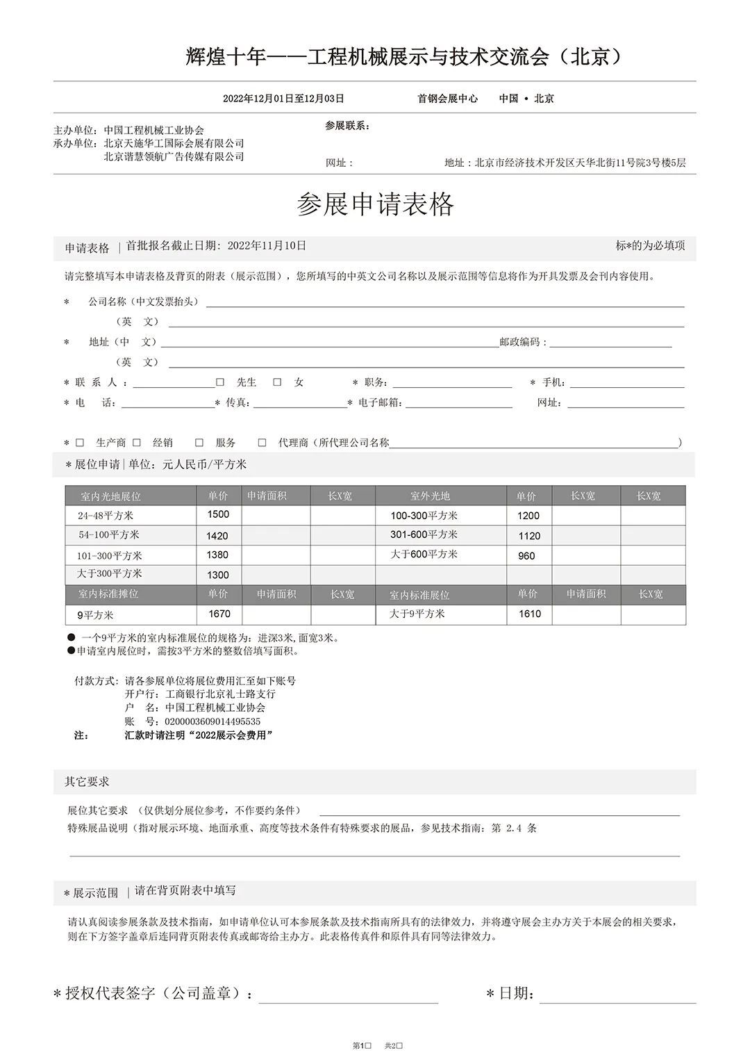 自協(xié)會發(fā)布舉辦“輝煌十年——工程機械展示與技術(shù)交流會(北京)”(以下簡稱“展示會”)通知后,得到了各參展單位的快速響應(yīng)和積極支持,有的已經(jīng)報名大面積參展,有的正在履行審批程序或來電表示參加展出,組委會深表衷心感謝!為及時傳遞展會信息,服務(wù)好廣大展商,辦好本次展示會,現(xiàn)向廣大展商正式發(fā)出邀請,并將有關(guān)展示會方案說明如下:一、為充分展示黨的十八大以來工程機械行業(yè)各領(lǐng)域取得的發(fā)展成就,協(xié)會研究決定召開本次展示會,邀請廣大協(xié)會會員和產(chǎn)業(yè)鏈上下游企業(yè)參展,共同分享企業(yè)發(fā)展成就和謀劃行業(yè)美好未來。二、展示會于2022年12月1日至3日在北京冬奧會滑雪大跳臺項目舉辦地——北京首鋼會展中心舉辦。屆時協(xié)會將邀請政府部門、相關(guān)用戶、媒體朋友和廣大觀眾到展示會現(xiàn)場參觀交流。12月3日(周六)實施社會公眾開放日,讓社會觀眾充分體驗工程機械發(fā)展魅力。三、北京首鋼會展中心適合舉辦室內(nèi)高品質(zhì)展示會,室外面積有限,而且適合承重較輕的產(chǎn)品展出。組委會初步規(guī)劃總展出面積2萬平米左右,希望各參展企業(yè)提供產(chǎn)業(yè)鏈上下游的先進技術(shù)產(chǎn)品和高端裝備進行展出,大型設(shè)備和示范工程應(yīng)用等可通過模型、圖片、視頻等方式展示。展示會主要目的是系統(tǒng)總結(jié)和全面宣傳十年來行業(yè)企業(yè)發(fā)展成就,參展方式可靈活多樣。四、組委會設(shè)定報名截止日期為2022年11月10日,以便統(tǒng)籌組織好運輸、布展和活動安排,高效推進各項運營服務(wù)工作,確保展出效果。五、組委會將展館規(guī)劃為綜合類企業(yè)、專精特新企業(yè)、單項冠軍、高端重器、智能裝備、綠色產(chǎn)品、高端配套、先進產(chǎn)業(yè)鏈供應(yīng)鏈等展區(qū),供各參展單位選擇。六、展示會期間組委會將舉辦“中國工程機械行業(yè)高質(zhì)量發(fā)展論壇”及其十多場系列會議、論壇和展示會選樹等活動。七、為便于展商報名和有序確定展位,本文隨附發(fā)布“展商報名表”、“展區(qū)規(guī)劃圖”、“展館示意圖”等,詳見附件。