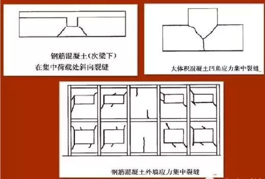 裂縫一般特征: 應力集中裂縫一般發(fā)生在門窗洞口的角部和平立面突出凹進的轉角處,且斜向楔形狀裂縫居多。在集中荷載較大的部位,易產生劈裂狀的裂縫。在預應力結構錨固端的局部承壓處,有時出現一條或數條裂縫,并呈放射形狀。