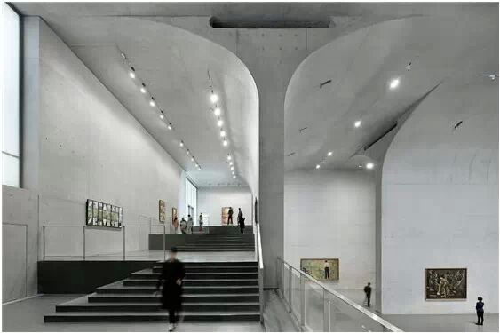 在“傘拱”結構的空腔里,地面以上的“傘拱”覆蓋空間,墻體和天花均為清水混凝土的表面,它們的幾何分界位置也變得模糊。這樣的結構性空間,在形態(tài)上不僅對人的身體形成庇護感,亦與保留的江邊碼頭的煤料斗產生視覺呼應。建筑的內部空間也得以呈現(xiàn)一種原始的野性魅力,而有著大小調節(jié)的空間尺度以及留有模板拼縫和螺栓孔的清水混凝土表面又會帶來一種現(xiàn)實感。這種“直白”式的結構、材料、空間所形成的直接性與樸素性,加上大尺度出挑所產生的力量感或輕盈感,使整個建筑與原有場地的工業(yè)特質間取得一種時間與空間的接續(xù)關系。地面以上的清水混凝土“傘拱”下的流動展覽空間和地下一層傳統(tǒng)“白盒子”式的展覽空間由一個呈螺旋回轉、層層跌落的階梯空間聯(lián)接,既原始又現(xiàn)實的空間和古代、近代、現(xiàn)代直到當代藝術的展覽陳列,這種并置的張力,呈現(xiàn)出一種具有時間性的展覽空間。