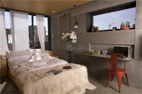 床的亮點設計在于它是可以伸縮的。白天可以推進去,這里充當飄窗的作用。墻面也是頗有創(chuàng)意和實用性,隱藏在墻上的混凝土板,拉下來變成方便的書桌或是餐桌。