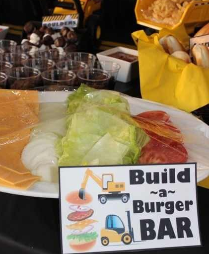 這里是主食區(qū),鑒于工程機械行業(yè)人人心靈手巧,請用此挖掘機DIY漢堡享用!各位,吃飽了也別忘了把這些土塊清清干凈那!