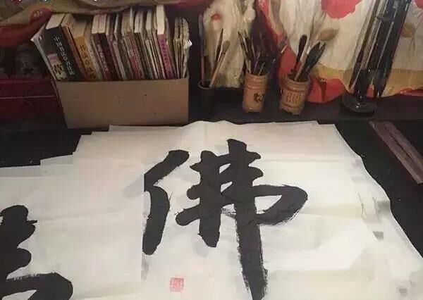 他家里有一個(gè)小書(shū)房,墻上掛滿了書(shū)法字畫(huà),書(shū)架塞滿了書(shū)。家人說(shuō)他不用去工地的時(shí)候,就悶在書(shū)房里寫(xiě)毛筆字。桌上摞著一疊裁好的方形宣紙,每張都寫(xiě)有一個(gè)大大的“佛”字,左下角蓋著印章。
