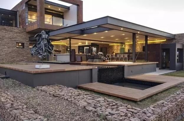 建筑師用鋼鐵,混凝土,玻璃為主要材料,結合就近取材的天然板巖和花崗巖,天然實木地板 ,打造了一個工業(yè)時代感的現代化豪宅,貫穿建筑的兩級錯落水景是設計中的主要亮點。