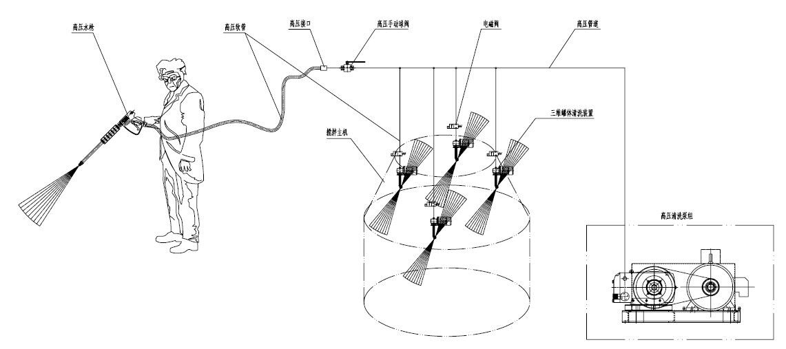 高壓清洗設備主機+三維旋轉清洗裝置,維護保養(yǎng)攪拌機內(nèi)壁的清洗利器!