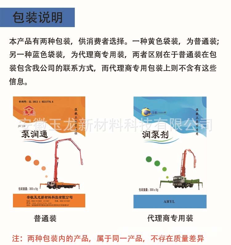 泵車潤管劑(泵潤通)產(chǎn)品使用了可降解彩色復(fù)膜包裝,包裝規(guī)格:50袋/箱,300克/袋。本產(chǎn)品應(yīng)儲存于防曬、通風(fēng)、干燥處,保質(zhì)期:三年。