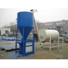 過傳感器的數(shù)據(jù)反饋,實(shí)現(xiàn)原料計(jì)量。計(jì)量好后的物料,通過螺旋輸送機(jī)導(dǎo)進(jìn)主斗提機(jī),提升到混合機(jī)上部待混料倉中。待混倉為氣動(dòng)大開門型,可以迅速將待混物料放入無重力
