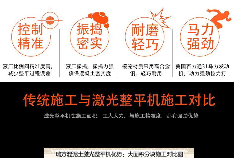 奧力德激光整平機是根據(jù)現(xiàn)代工業(yè)廠房、大型商場、 及其他大面積水泥混凝土地面等對地面質量如 、平整度、水平度等越來越高的需求而研制的。使用精密激光整平機鋪注整平的水泥混凝土地面,較按常規(guī)方法所鋪注的地面質量要好得多——地面平整度及水平度提高3倍以上,密實度及強度提高20%以上。同時還能夠提高工效超過50% , 并節(jié)省約35%的人工。此外,它能容易地鋪注高強 、低坍落度混凝土和纖維泥凝土。其激光系統(tǒng)配備多種自動控制元件,以每秒10次的 實時監(jiān)測整平頭的標高,確保鋪注的地面平整度和水平度得到有效的控制。同時,其強力振動器振動頻率達4000次/分鐘,確?;炷琳駬v密實,使整個鋪注的混凝土基體均質、致密