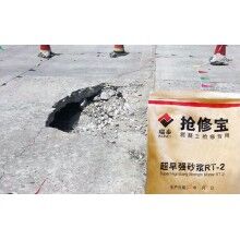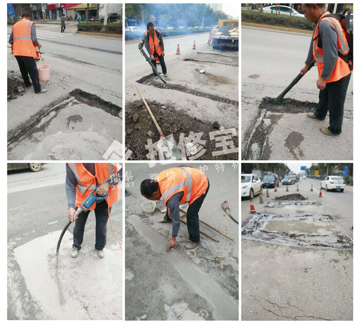 以使用搶修寶水泥路面修補料RT-2為例來說明。使用搶修寶水泥混凝土路面修補料修補病害非常簡單,首先在修補前,一定要對水泥混凝土路面坑槽進行清理,然后再用高壓水槍沖刷干凈,沖刷后用風槍將明水吹干,保持濕潤狀態(tài);隨后根據(jù)坑槽的深淺,按施工比例充分攪拌修補料,攪拌后攤鋪于坑槽部位收光養(yǎng)護即可。搶修寶水泥路面修補料的粘結(jié)力表現(xiàn)、抗壓耐磨表現(xiàn)、無收縮無老化表現(xiàn)均良好,修補后材料不易脫落不易老化,使用壽命長,可以一次性修復水泥混凝土路面坑槽病害,恢復路面美觀及功能。