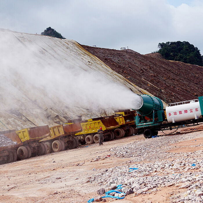 工作原理:霧炮機采用高壓水泵和特殊噴嘴將水霧化成直徑約10-200μm的細水霧。 水霧通過高性能遙控風扇送到粉塵濃縮場。 水霧與灰塵結(jié)合,吸收,凝聚,稱重,在自身重力作用下沉降到地面,達到有效降塵的目的,有效除塵率可達95%,