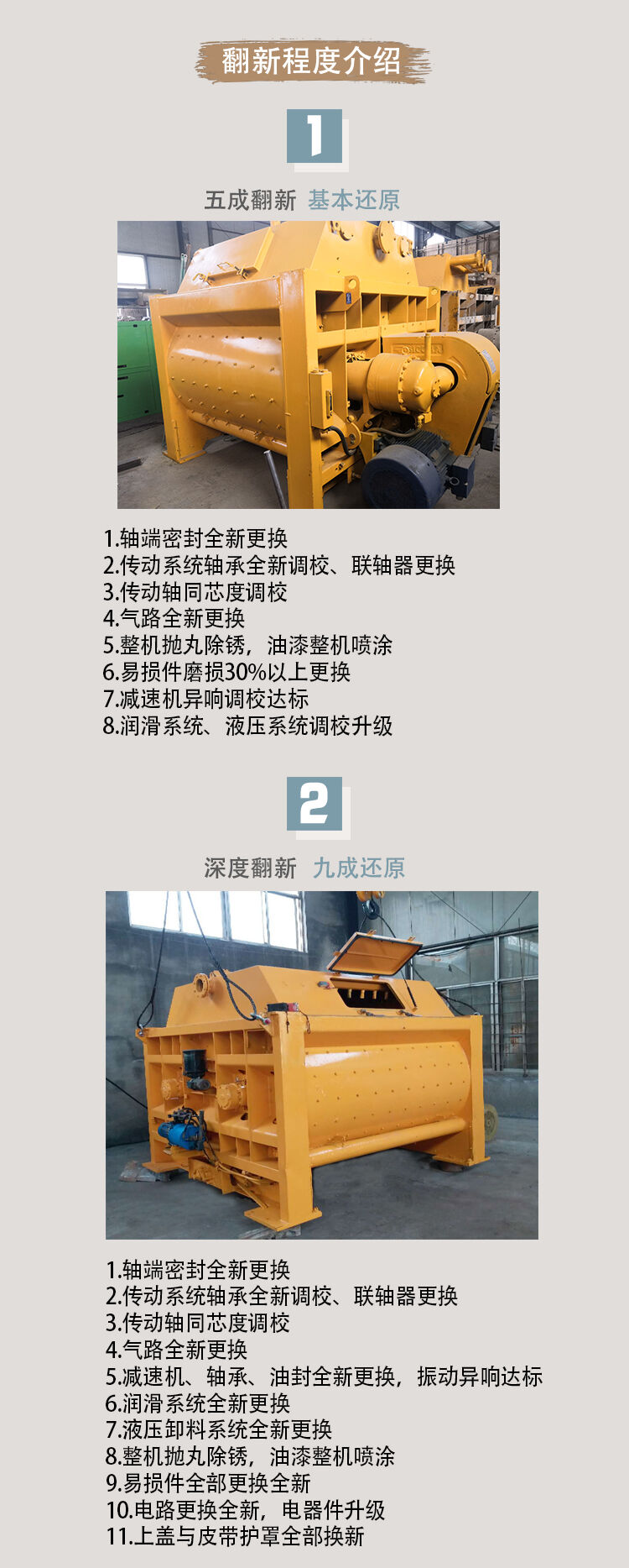 隨著國(guó)家基礎(chǔ)建設(shè)的大力推進(jìn),攪拌站轉(zhuǎn)場(chǎng)的速度也在加快,有些攪拌機(jī)使用2-3年就被閑置,未能發(fā)揮出他的最優(yōu)性能。一些攪拌機(jī)的主要部件性能任然很好。為了將這一部分設(shè)備重新利用,我公司擁有專(zhuān)業(yè)的人員、評(píng)估、回收、檢修、然后再以嶄新的面貌服務(wù)客戶(hù)。