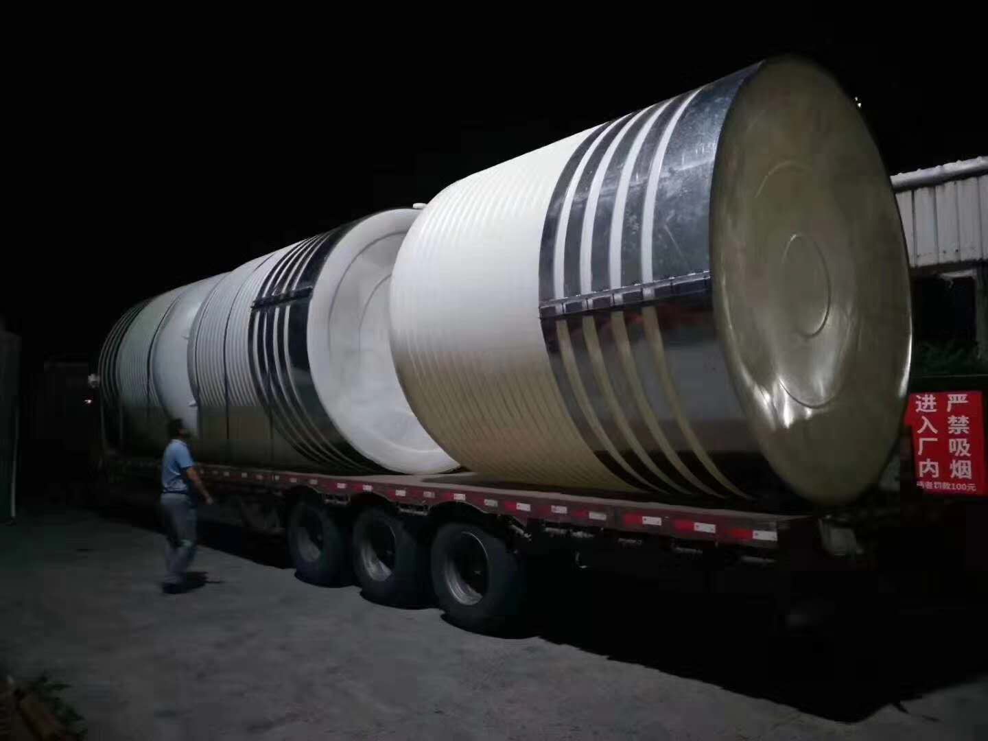 特性三:常壓產品,不可施于超過常壓(1個大氣壓力)以上之正壓或負壓;若需攪拌或酸堿濃度比重在1.2以上時,應加裝補強套及加厚桶體壁厚為宜。此項特性尤其在盛裝容積超過10000L以上的桶體特需注意之。(硫酸、硝酸濃度超過28%一律使用特級產品并加裝補強套)