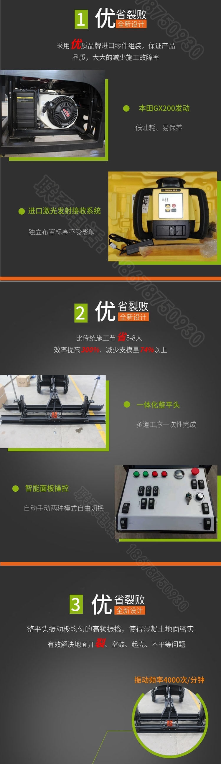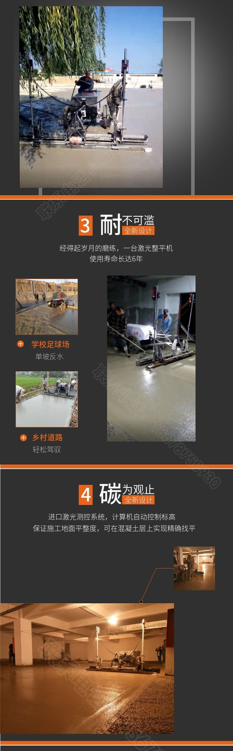 一、減少人力成本,翻倍提高效率:傳統(tǒng)工藝施工人數(shù)較多,需要支模板(槽鋼)、打點、攤鋪。需要人力20人左右。每天施工面積在700平方。采用混凝土激光整平機(jī)總?cè)藬?shù)比傳統(tǒng)工藝減少一多半??蓡稳瞬僮?。每天施工面積在2500平---3500平,大大降低了人力成本。