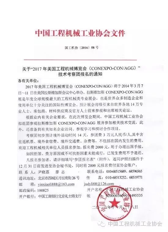 根據(jù)業(yè)內有關企業(yè)要求,在此次博覽會期間,中國工程機械工業(yè)協(xié)會擬組團參觀拉斯維加斯CONEXPO-CON/AGG展并參加相關技術交流,此外,還準備到有關知名企業(yè)訪問、參觀學習和探討合作項目。