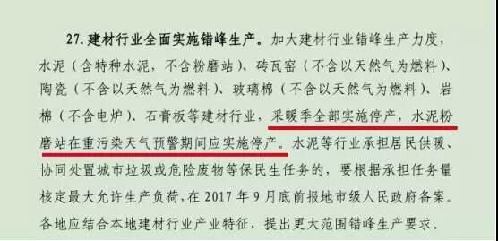 近日,環(huán)保部發(fā)布《京津冀及周邊地區(qū)2017-2018 年秋冬季大氣污染綜合治理攻堅(jiān)行動(dòng)方案》,2017年10月至2018年3月,水泥(含特種水泥,不含粉磨站)、磚瓦窯(不含以天然氣為燃料)、陶瓷(不含以天然氣為燃料)、玻璃棉(不含以天然氣為燃料)、巖棉(不含電爐)、石膏板等建材行業(yè),采暖季全部實(shí)施停產(chǎn),水泥粉磨站在重污染天氣預(yù)警期間應(yīng)實(shí)施停產(chǎn)。