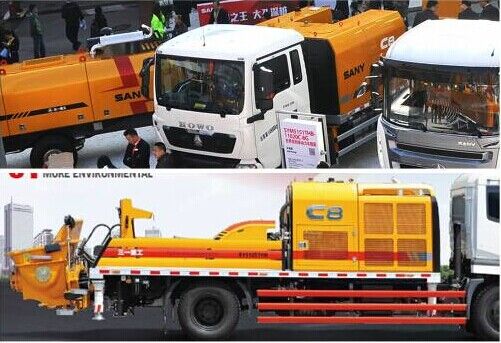 三一HOWO國Ⅳ排放標(biāo)準(zhǔn)單動(dòng)力車載泵(無上裝動(dòng)力)是bauma展覽會(huì)上展出的唯一一臺(tái)車載泵。配置單一動(dòng)力和進(jìn)口分動(dòng)箱,從而節(jié)約了一臺(tái)上裝泵送柴油發(fā)動(dòng)機(jī),是該車的最大亮點(diǎn)。該車載泵柴油機(jī)功率為206kW,6.87L排量,配置400L大油箱,混凝土理論輸送壓力10/20MPa,理論輸送量115/60m3/h。